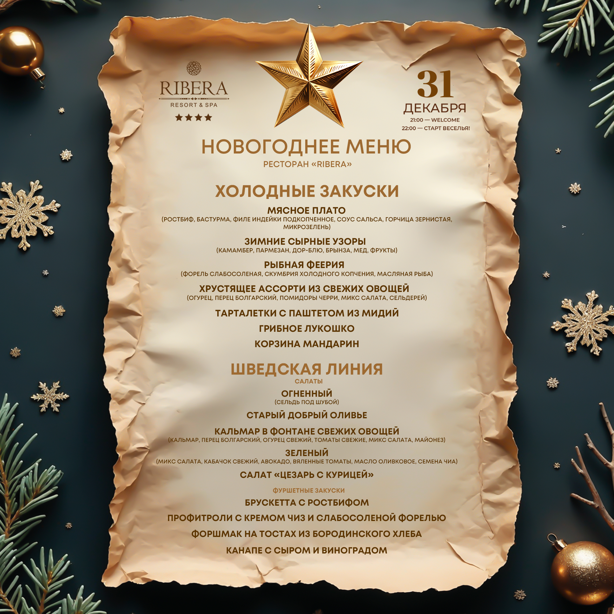 В этот волшебный вечер Ribera превратится в сказочный мир, где сбываются желания. Вас встретят улыбки, аромат изысканных блюд и мерцание бокалов игристого. Пространство наполнится музыкой, смехом и настоящим предвкушением чуда.